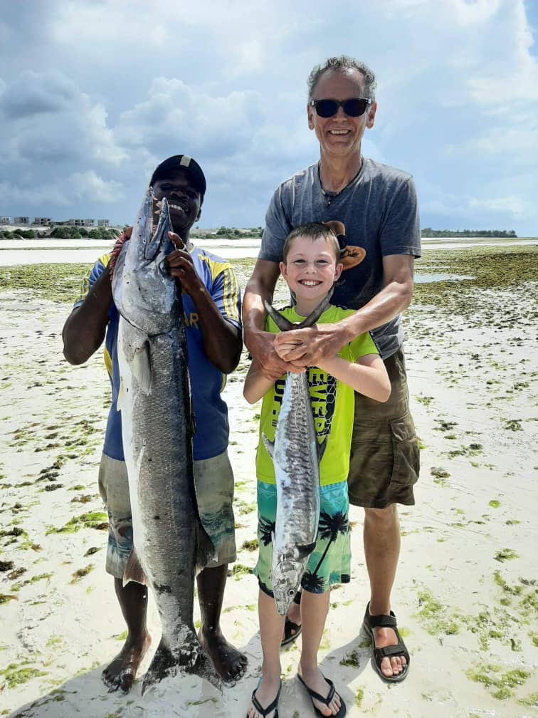 Three people laugh and compare their catches, showcasing the fun and camaraderie of the fishing games.